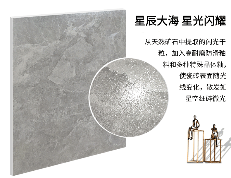 星光釉 【產品介紹】從天然礦石中提取的閃光干粒,加入高耐磨防滑釉料和多種特殊晶體釉,使瓷磚表面隨光線變化,散發如星空細碎微光。星光釉系列經過30000噸超大壓機無摸壓制成型,胚體受力更均勻,具有更高平整度、超強抗沖擊、韌性與硬度。