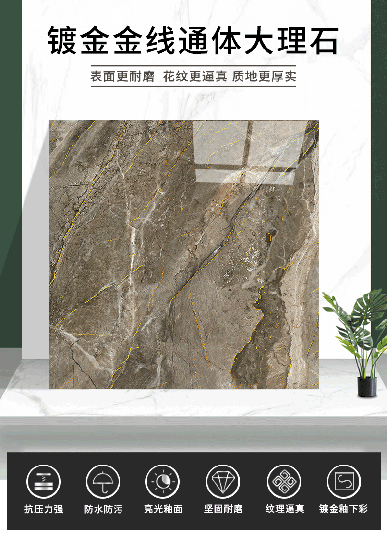金線金粉 【產品介紹】航天級激光鍍金工藝,鉆石雕刻技術,高溫慢燒,釉層不吸污吸水率低,真空鍍金燒成后再進行真空電鍍工藝,平整如鏡面,精拋細磨,磚面平整光滑細膩光澤度、亮度、硬度較高。立體紋理,釉下彩工藝,三次淋釉增加磚面的立體感。