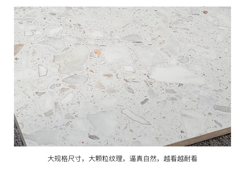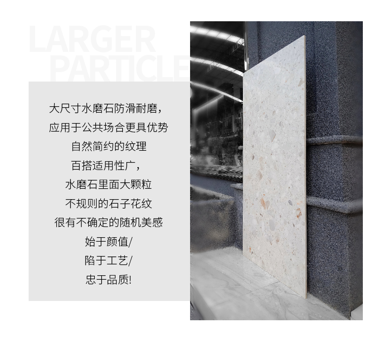 大尺寸水磨石防滑耐磨,應用于公共場合更具優(yōu)勢,自然簡約的紋理,百搭適用性廣,水磨石里面大顆粒,不規(guī)則的石子花紋,很有不確定的隨機美感。始于顏值/陷于工藝/忠于品質!