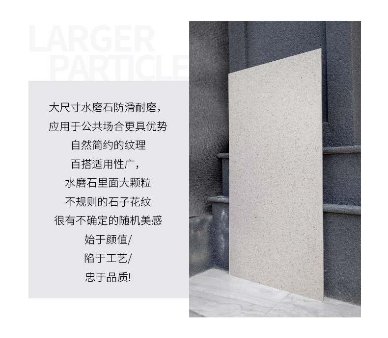 大尺寸水磨石防滑耐磨,應用于公共場合更具優勢,自然簡約的紋理,百搭適用性廣,水磨石里面大顆粒,不規則的石子花紋,很有不確定的隨機美感。始于顏值/陷于工藝/忠于品質!