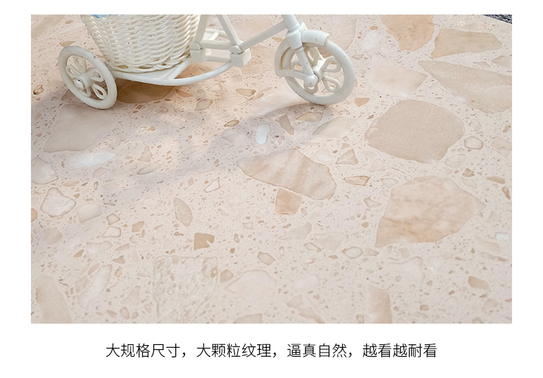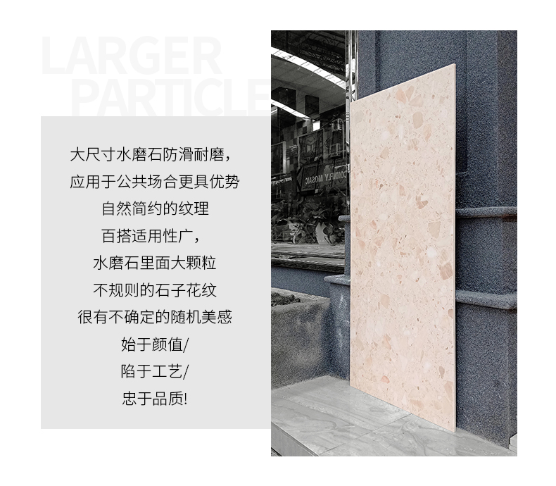 大尺寸水磨石防滑耐磨,應用于公共場合更具優勢,自然簡約的紋理,百搭適用性廣,水磨石里面大顆粒,不規則的石子花紋,很有不確定的隨機美感。始于顏值/陷于工藝/忠于品質!