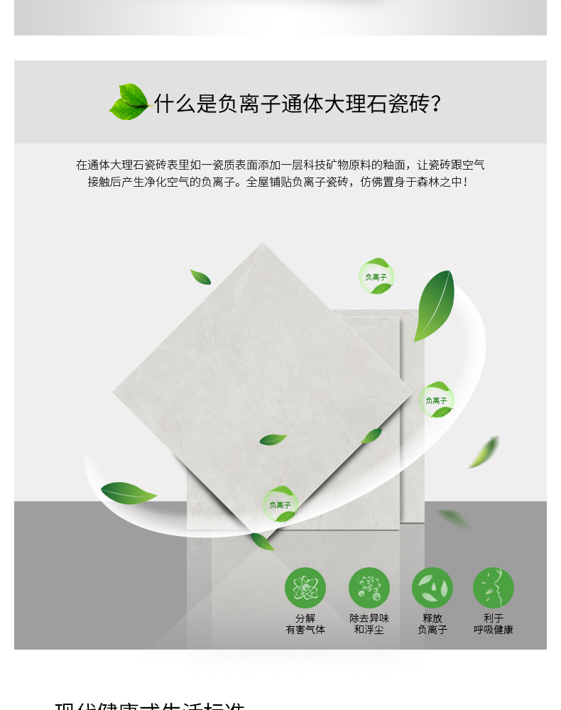 金曼古負離子瓷磚,能持續(xù)產(chǎn)生負離子,提高居室內空氣負離子濃度,改善室內空氣質量,提升人體健康水平。負離子被稱為空氣維生素,負離子瓷磚創(chuàng)造安全健康的空間環(huán)境。工程用磚全拋釉地磚、通體大理石瓷磚、金剛石地磚等支持加工定做家裝瓷磚批發(fā)。