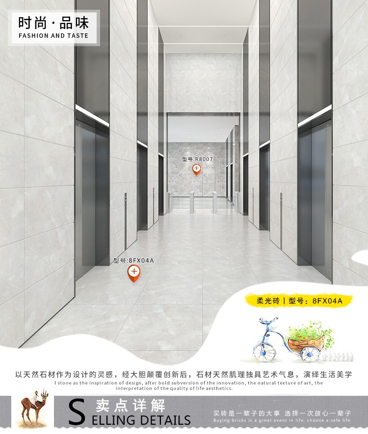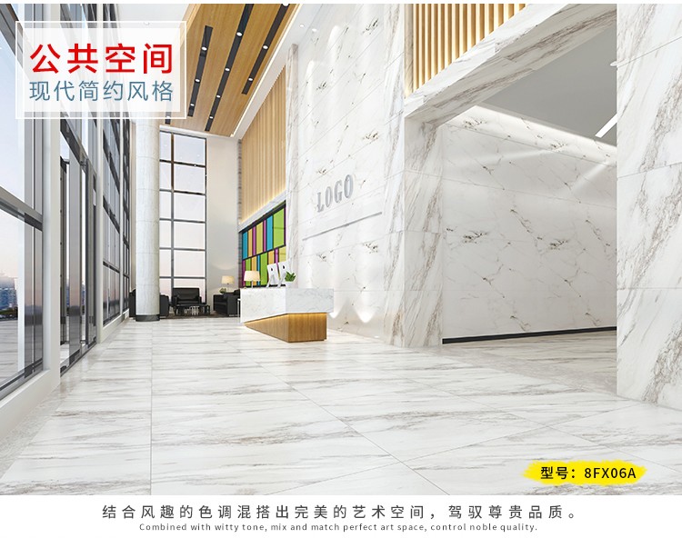 柔光瓷磚是磚面反射介于強光與弱光之間的一類瓷磚,其結合亮光類瓷磚的高調明艷裝飾和啞光類瓷磚的低調內斂搭配效果,通過動態柔光蠟拋技術,降低產品反光率,從而達到人體舒適的視覺感受以及無光污染的空間裝飾效果。優點:1.視覺舒適,無光污染 2.堅固耐磨,不易刮花.